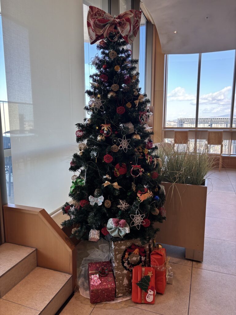 この度、ホテルウィングインターナショナルプレミアム金沢駅前様のロビーにあるクリスマスツリーに、当事業所が制作した「金沢水引のオーナメント」を飾っていただきましたのでお知らせいたします。